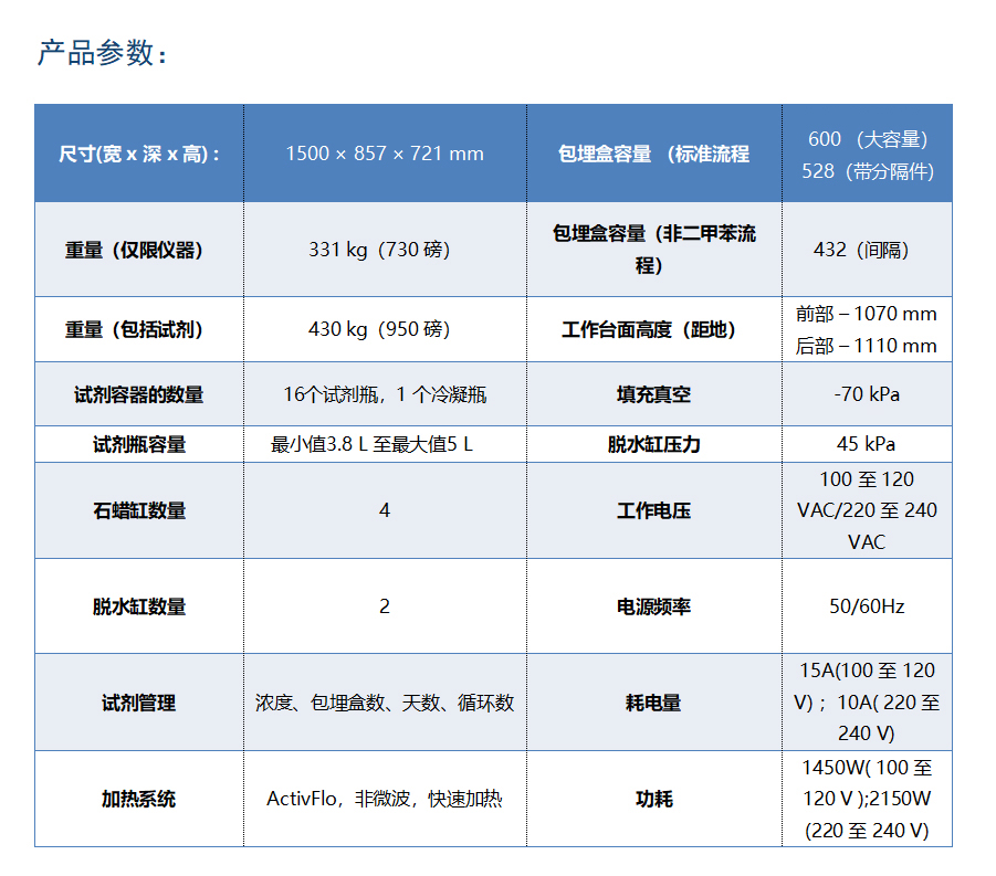 直觀的觸摸界面,操作更便捷;試劑瓶LCD背光照明和標簽便于識別液位和試劑狀態,更醒目;Parablocks速熔石蠟與蠟缸匹配,無需看管,更省力。